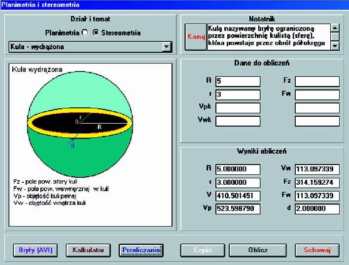- Obliczenia z zakresu stereometrii i geometrii, animowane prezentacje podstawowych brył geometrycznych.