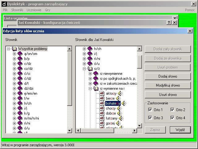 Korzystając z wbudowanego w program edytora można zmodyfikować (dla każdego dziecka osobno) listy słów występujących w ćwiczeniach ortograficznych. Dzięki temu łatwo skorelować listę słów i problemów ortograficznych z omawianym w czasie terapii materiałem. Co bardzo ważne, Dyslektyk współpracuje ze Sposobem na dysleksję i zmodyfikowanie listy słów w jednym programie zostanie automatycznie uwzględnione w drugim.