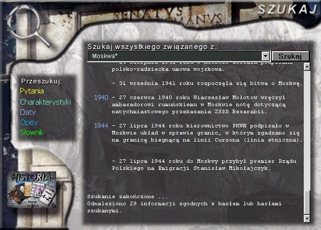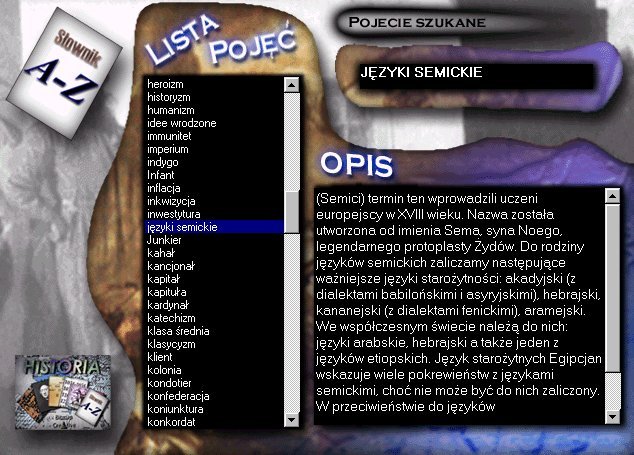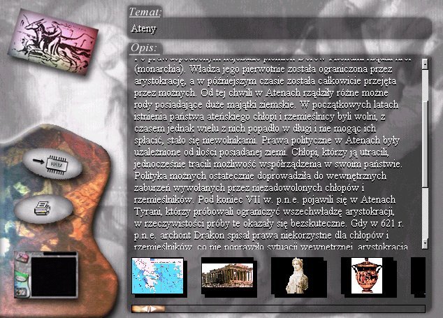 Bardzo szeroki zakres programu umożliwia poznanie historii od czasów starożytności poprzez średniowiecze, dzieje nowożytne i najnowsze, aż po wydarzenia II wojny światowej (zakres: szkoła podstawowa, gimnazjum i szkoła średnia). To nieoceniona pomoc dla wszystkich pragnących zgłębić tajniki historii! Przejrzysta konstrukcja programu oraz bardzo sprawny moduł wyszukiwania pozwalają szybko odnaleźć poszukiwany materiał. Program składa się z kilku modułów. Oto ważniejsze z nich: