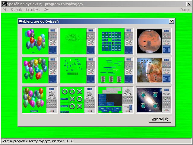 Drugim najważniejszym źródłem problemów u dzieci z dysleksją są braki w zakresie umiejętności językowych. Rozbudowanie istniejącego programu o kolejne ćwiczenia zmniejszyłoby czytelność interfejsu użytkownika. Postanowiliśmy więc wykorzystać sprawdzone rozwiązania - dwa tryby pracy, lekcje prowadzone przez nadzorcę, prosty interfejs użytkownika - i stworzyć nowy program, przeznaczony głównie do ćwiczenia umiejętności językowych. Dzięki temu Sposób na dysleksję znakomicie nadaje się nie tylko jako uzupełnienie Dyslektyka w terapii pedagogicznej, ale również jako samodzielne narzędzie do wykorzystania w terapii logopedycznej.