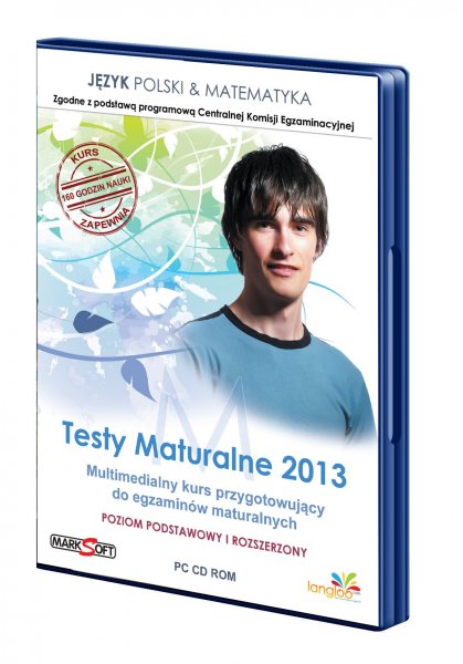 „Testy Maturalne 2013 Język Polski i Matematyka Poziom podstawowy i rozszerzony” to multimedialny kurs komputerowy przygotowujący maturzystów do egzaminu maturalnego z języka polskiego i matematyki. Kurs zawiera zestaw testów kompleksowo sprawdzających wiedzę z obu tych przedmiotów na poziomie podstawowym i rozszerzonym, a także bogate repetytorium pozwalające na powtórzenie materiału.