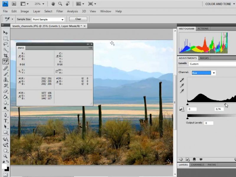 - Praca z wykorzystaniem kanałów: korekcja koloru, zakresu tonalnego oraz tworzenie zdjęć czarno-białych.