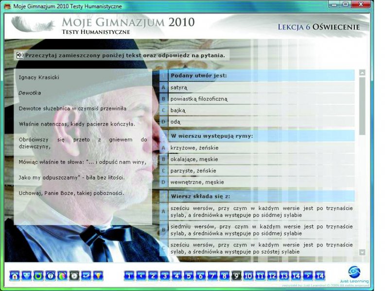 To multimedialny, interaktywny kurs komputerowy przygotowujący do zdania egzaminu gimnazjalnego z części humanistycznej. Forma i zawartość merytoryczna programu odpowiada wymaganiom egzaminu. Program sprawdza wiadomości i umiejętności ucznia z zakresu przedmiotów: języka polskiego, historii i wiedzy o społeczeństwie.