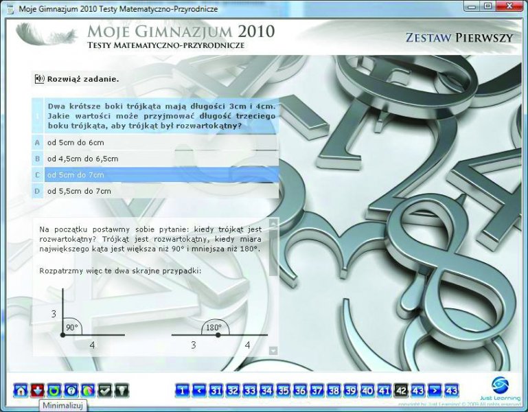 Program Moje Gimnazjum 2010 Testy Matematyczno - Przyrodnicze składa się z czterech bogato ilustrowanych oraz w pełni udźwiękowionych zestawów testów, które zostały opracowane na podstawie pytań z przedmiotów matematyczno - przyrodniczych zawartych w egzaminach gimnazjalnych zebranych z całej Polski w latach ubiegłych. Poprzez rozwiązywanie kilkunastu rodzajów interaktywnych ćwiczeń uczeń sprawdza stan swojego przygotowania do zdania egzaminu i uzyskuje informacje, które to partie materiału sprawiają mu jeszcze problemy.