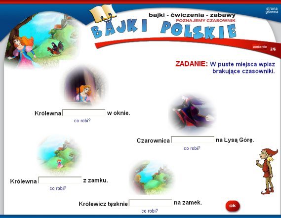 W programie Bajki polskie - Czasownik obok ćwiczeń utrwalających wiedzę o czasowniku i jego odmianie, znajduje się także szereg innych, sprawdzających m.in.: znajomość reguł pisowni i ortografii, umiejętność rozumienia tekstu i porządkowania wydarzeń w kolejności chronologicznej.