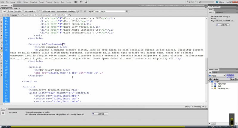 Nasz kurs jest doskonałym wprowadzeniem do języka HTML5. Jeśli jesteś zupełnie początkującym użytkownikiem to ten kurs pozwoli ci w krótkim czasie opanować kluczowe zagadnienia. Dowiesz się jak zbudować stronę od podstaw, jak wstawiać tabele, listy, odnośniki, obrazki oraz jak tworzyć formularze. Duży nacisk położyliśmy na omówienie nowości w najnowszej specyfikacji języka HTML. Poznasz rozwiązania, które pozwolą ci na stworzenie przejrzystej struktury witryny. Dowiesz się też jak umieścić na stronie multimedia korzystając z nowych znaczników wprowadzonych w HTML5. Nawet jeśli znasz już HTML to ten kurs umożliwi ci bezproblemowe opanowanie nowości, które pojawiły się w najnowszej specyfikacji języka. W ostatnich rozdziałach pokazujemy jak wykonać projekt gotowej witryny od A do Z: od podstawowej struktury do umieszczenia strony na serwerze.