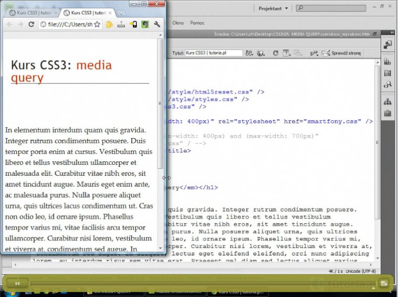 30. Media queries – Użycie nowych funkcji CSS3 w celu dopasowania strony do oreślonego medium (11:29 min)