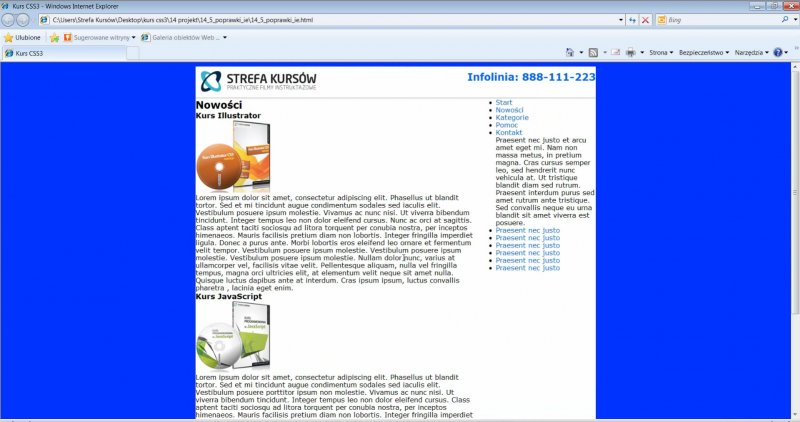 Nasz kurs omawia wszystkie istotne aspekty tej wspaniałej technologii. Nawet kompletnie początkujące osoby będą w stanie szybko opanować podstawy. Użytkownicy bardziej zaawansowani będą mieli okazję zapoznać się z nowościami CSS3. Przed ponad 8 godzin omawiamy bardzo szeroki zakres tematów. Dowiesz się jak stosować sektory i pseudoklasy. Poznasz rozwiązania umożliwiające formatowanie tekstu, tabel, list czy odnośników. Dowiesz się jak korzystać z dziedziczenia oraz jak definiować marginesy, dopełnienia oraz obramowania. Omówimy również takie zagadnienia jak tworzenie układu wielokolumnowego, pozycjonowanie elementów oraz edycja tła. Przy okazji poznasz sporo praktycznych podpowiedzi: dowiesz się jak dostosować wygląd witryny do różnych przeglądarek, jak przygotować alternatywne style do wydruku itp. Duży nacisk położyliśmy na omówienie nowych funkcjonalności CSS: gradientów, transformacji, zaokrąglonych narożników, cieni, przejść i odbić. Całość zakończymy stworzeniem praktycznego projektu z użyciem nowoczesnych rozwiązań.