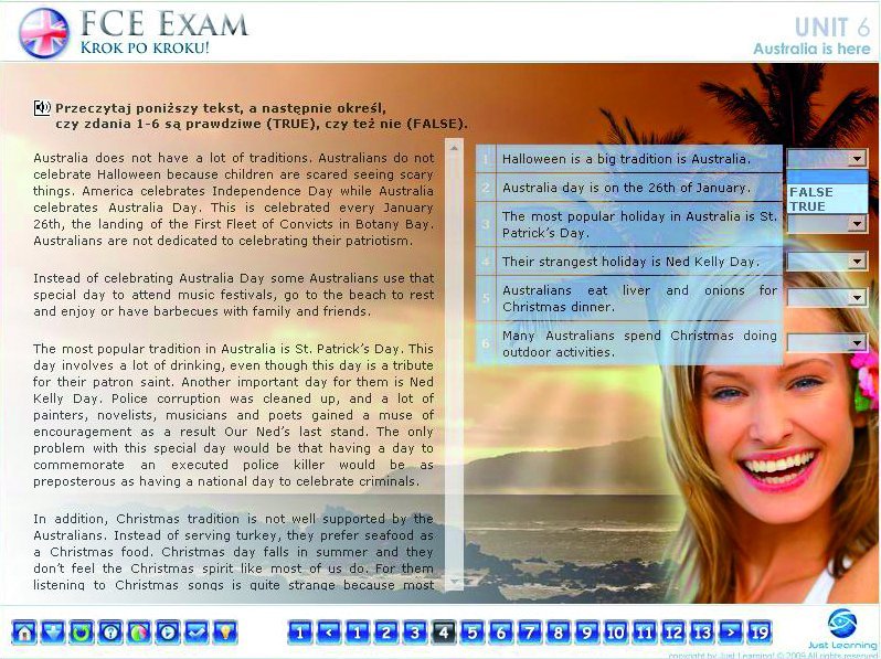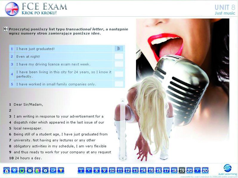 Ponad 30 typów ćwiczeń zawartych w programie pozwala na zapoznanie sie z materiałem merytorycznym oraz formą ćwiczeń występujących podczas rzeczywistego egzaminu FCE.