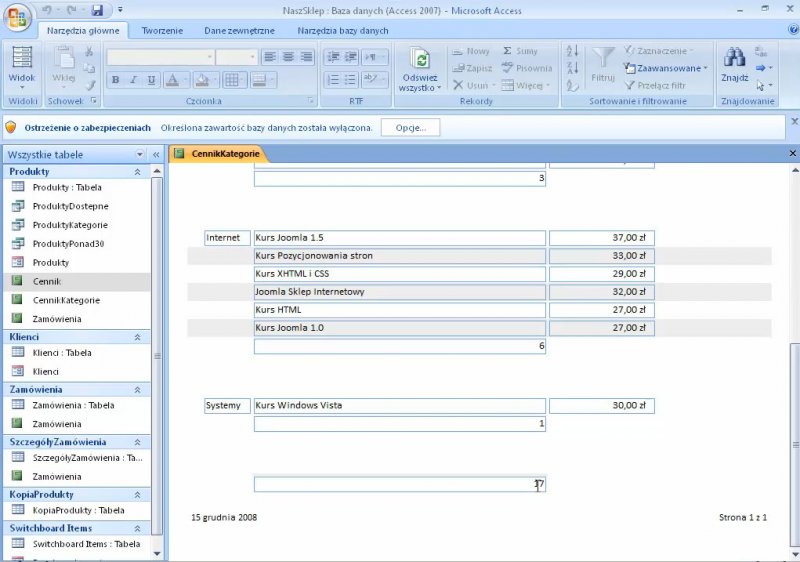 Kwerendy – Na początku pokażemy Ci jak utworzyć prostą kwerendę. Następnie będziemy do niej wprowadzali różne zmiany. Dowiesz się również jak stworzyć kwerendę, która pobiera dane z kilku różnych tabel. Omówimy także tzw. kwerendy akcji, które ułatwią Ci aktualizację dużej liczby rekordów.
