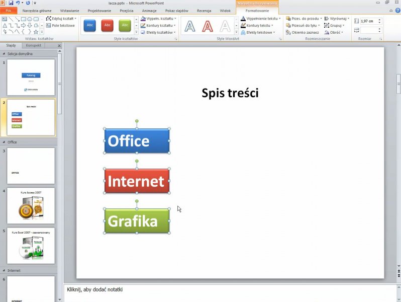 - Rozbudowa prezentacji o tzw. akcje oraz wstawianie odnośników.