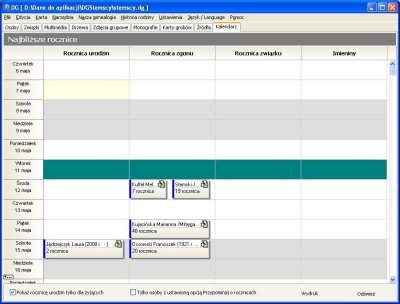 - tworzenie kalendarium rodzinnego zawierającego daty urodzin, imienin, zawarcia związku;