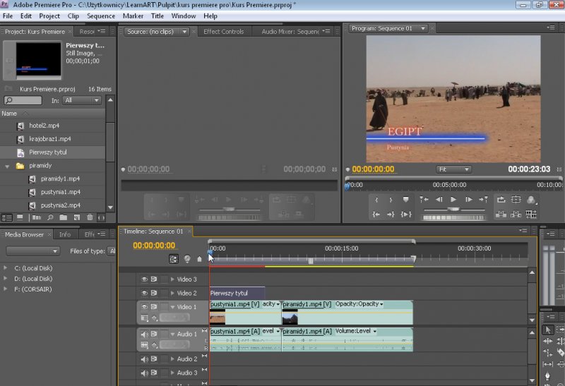 24. Wstawianie tytułów do sekwencji – Tytuły, które dotychczas tworzyliśmy będziemy wstawiali do naszej sekwencji. Dowiesz się m.in. jak zdefiniować czas wyświetlania tytułu oraz jego położenie w sekwencji. (02:31)