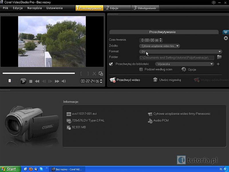 06. Przechwytywanie filmu z kamery – Przechwytywanie materiału wideo z kamery nagrywającej na taśmach mini DV. (04:17 min)